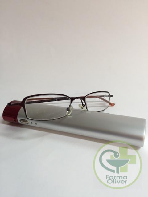 Gafas de bolsillo con estuche metálico rojo.