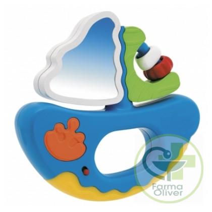 Apretando el ancla, se escucha el sonido del mar y alegres melodías. Sobre una de las velas hay un espejito y sobre la otra, anillos de colores que se pueden girar.